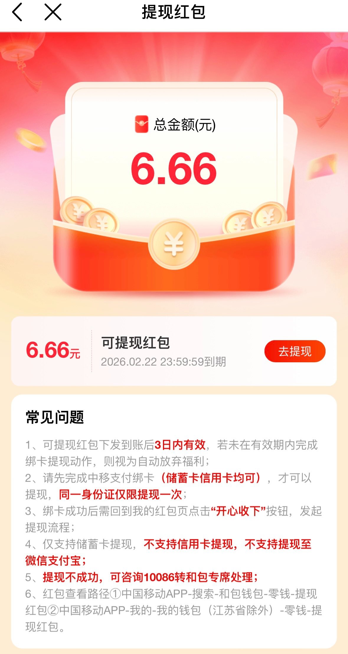 用的是移动号码的兄弟APP登入在搜索框下面有一个“领至高6.66新春红包”点进去绑定银行卡提现就好了